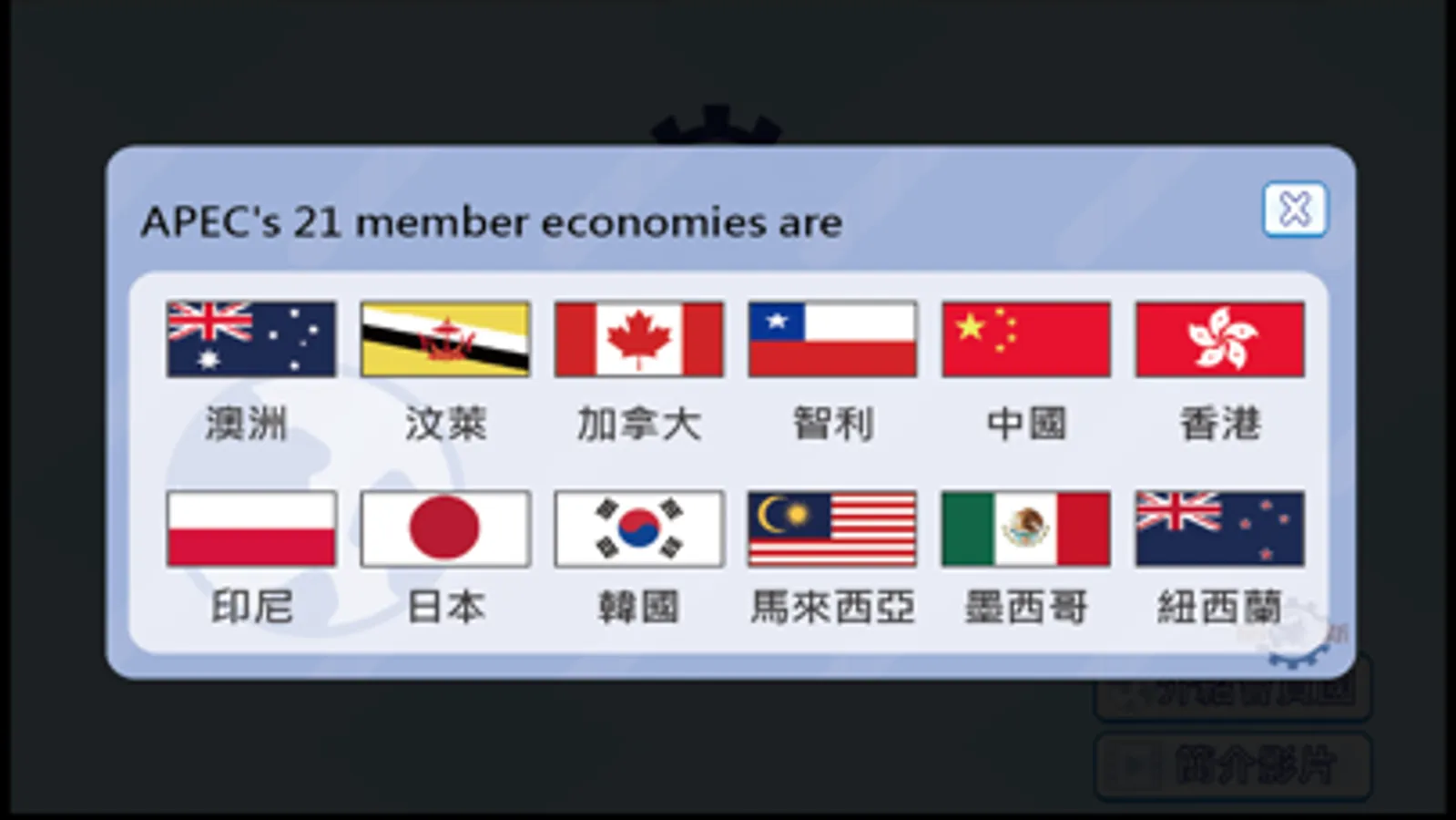 本App主要目的在於讓大眾認識國際會議主題相關知識內容,包括:亞太經濟合作會議(APEC)的相關知識、國際會議常用的專業英文用語縮寫等,透過互動科技遊戲方式,體驗國際會議進行的方式、氛圍、事前的準備,例如:APEC 21個會員國的國旗、元首、政治、文化、經濟、教育等全方位發展的內容。