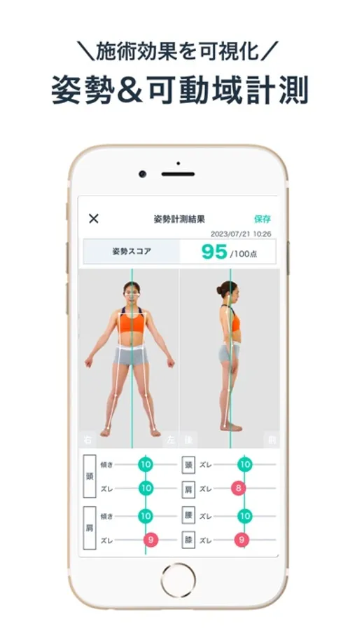 頭・肩・腰・膝の左右前後のズレと傾きから姿勢をスコア化!