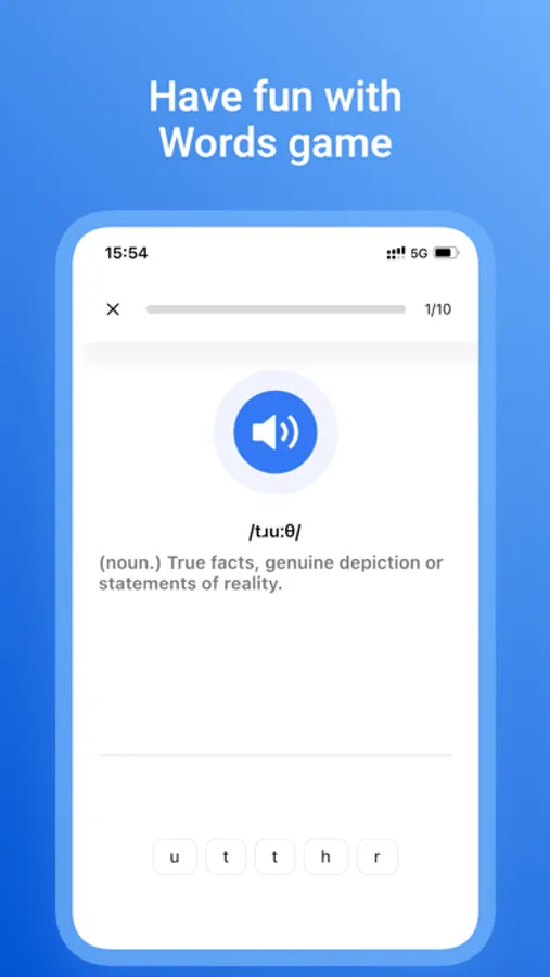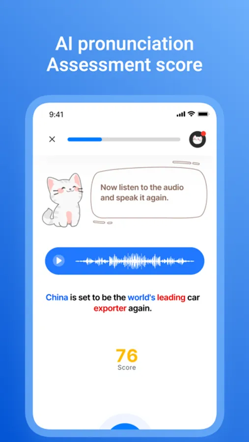 - Listen and repeat exercises with AI analysis to improve pronunciation and fluency;