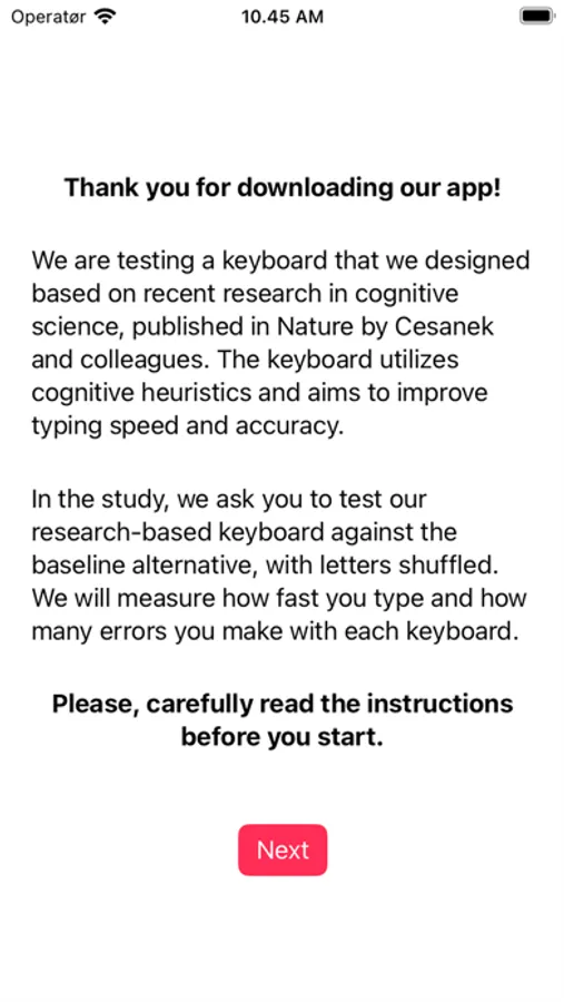 Participate in an experiment to assess the typing speed and accuracy the keyboard offers. You will be asked to transcribe a series of sentences both using the keyboard we have developed, and with a baseline frequency-based shuffled keyboard. Upon completing the typing task, we would appreciate your feedback through a brief questionnaire about your user experience and preferences. Download Typing Efficiency Experiment now to join the study and evaluate its impact on your typing efficiency.