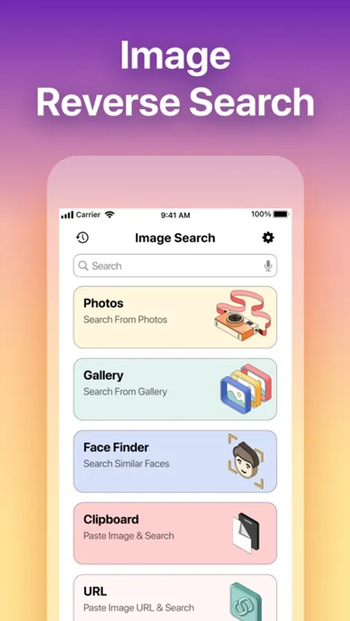 - Directly search for photos from your device's camera, photo library, clipboard and files.