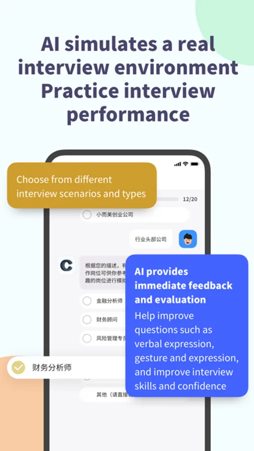 3.Practice interview performance in real interview situations. You can choose different interview scenarios/types and record your own interview answers. Boost your interview skills and confidence by providing instant feedback and assessments to assist with oral improvement, posture and facial expressions.
