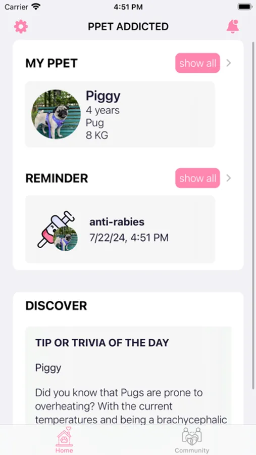 PPET Addicted is the indispensable app for all pet owners who want to keep track of their four-legged friends' clinical information, receive personalized reminders, and discover fascinating aspects of the animal world. Download the app today and simplify your experience in caring for your pets.