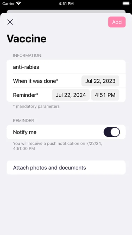 Thanks to the app's advanced reminder feature, you can set personalized alerts to remind you of important deadlines. For example, if you have scheduled a vaccine for your dog, you can set a reminder date and receive a push notification that will remind you to book the appointment.