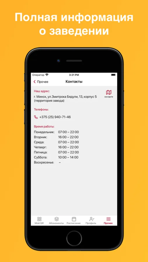 Получайте информацию о своих занятиях и абонементах, а также полную информацию о заведении.