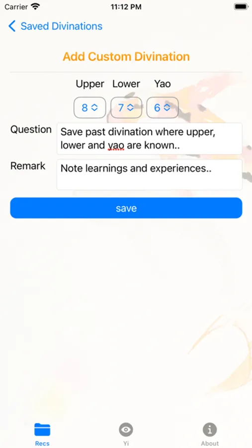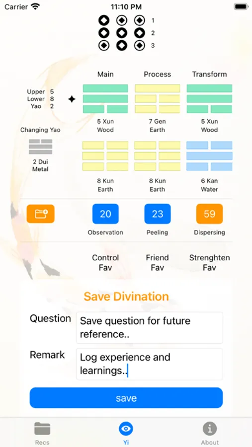 The Yi provides quick access to a Yi Jing or I Ching cast. Like what a scientific calculator is to an aspiring mathematician, this app provides the cast, while you will need to learn how to interpret and form circumstantial interpretations of your own.