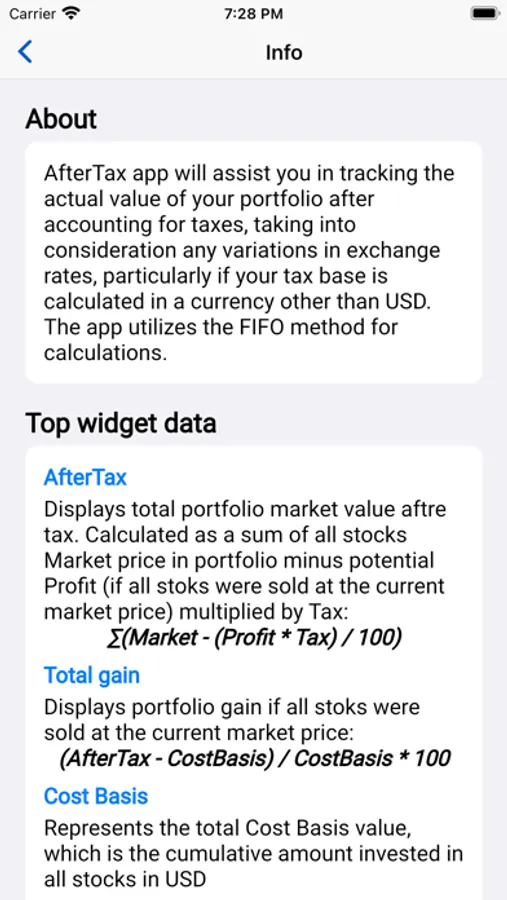 AfterTax app helps you to track the true value of your portfolio by considering taxes. The app uses the FIFO method for calculations and consider exchange rate differences (for non-USD currencies). It ensures accurate and comprehensive portfolio evaluation with tax considerations in mind.
