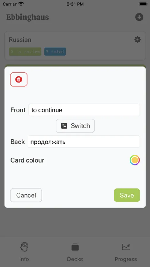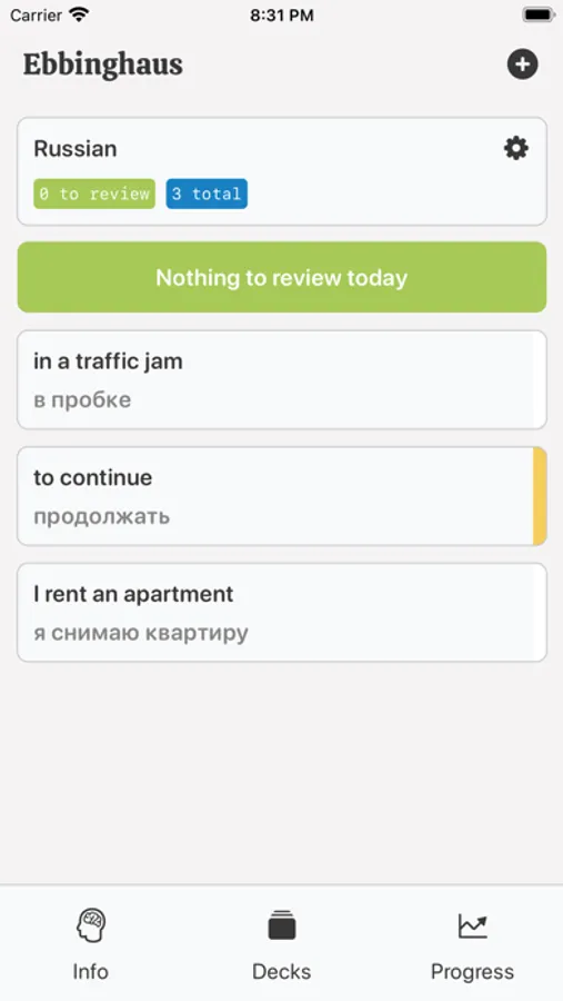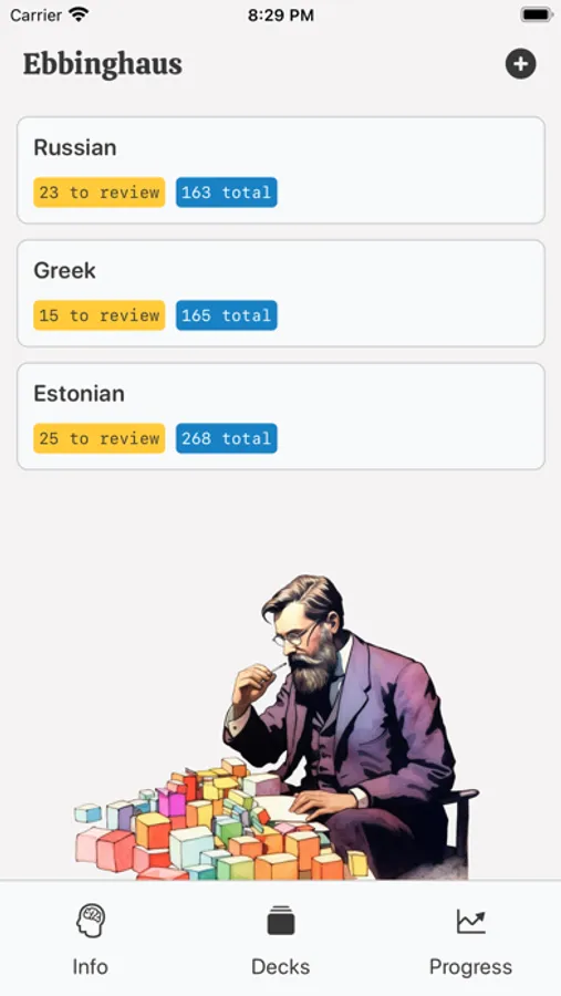 Ebbinghaus is perfect if you want a SIMPLE, BEAUTIFUL flashcard app, with NO ADVERTS, requiring NO INTERNET CONNECTION!