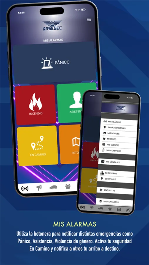 - Botones de pánico policial, bomberos y médico, con envío de posición geográfica, sonido e imágenes de tu emergencia (MIS ALARMAS)