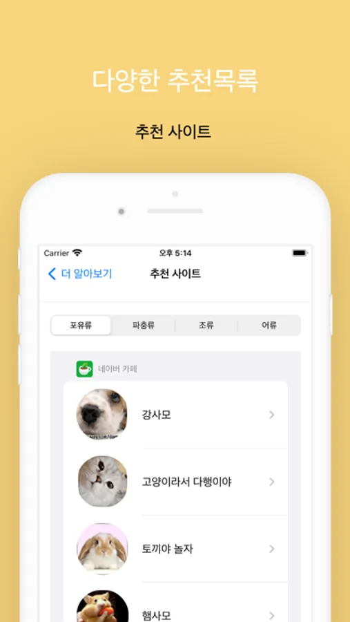 * 반려동물에 대한 다양한 네이버 카페, 유튜버들의 영상에 쉽게 접근할 수 있는 페이지입니다.