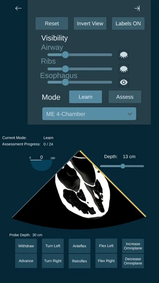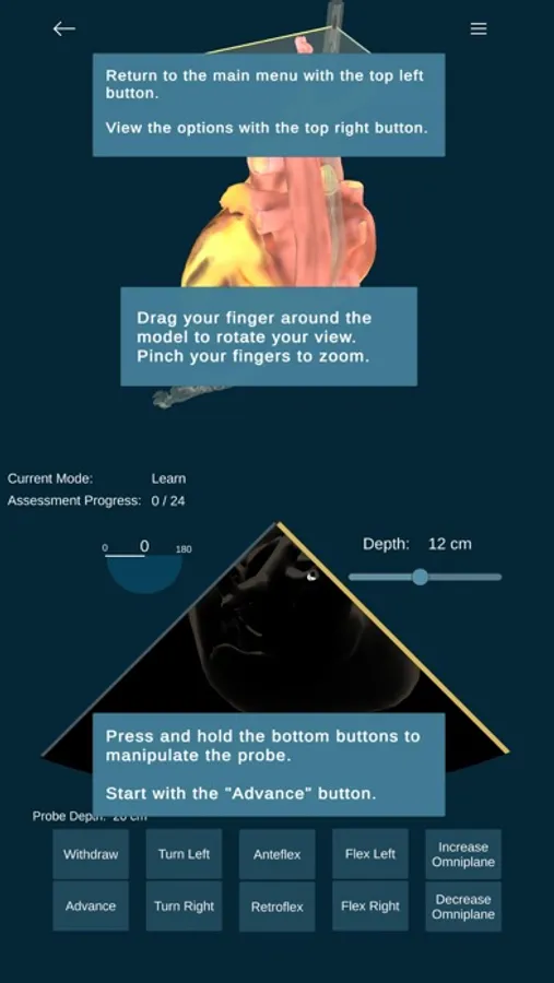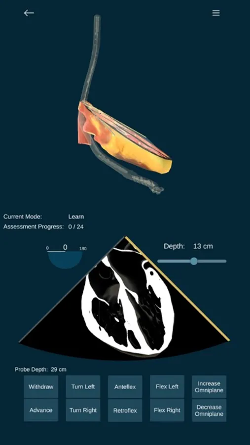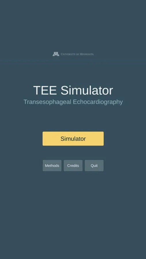 The University of Minnesota TEE mobile app allows physicians, students, and the general public to access a real, animated human heart for training transesophageal echocardiography. This simulator allows students to understand the controls of a TEE probe along with the ability to see how the two-dimensional image of an echo screen is mapped to the three dimensional heart. This simulator can be used to train for TEE certifications and improve the general abilities of all TEE users by training whenever and wherever they want for free.