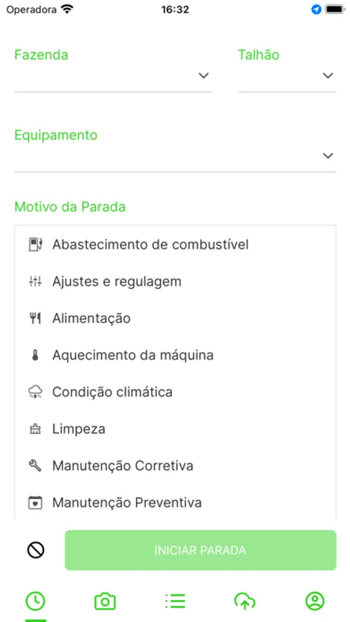 Ao utilizar o aplicativo, os usuários podem registrar o motivo específico de cada parada do equipamento agrícola. Isso pode incluir razões como alimentação, manutenção preventiva, manutenção corretiva, condições climáticas, limpeza e outros motivos relevantes. A ideia é fornecer uma forma organizada e centralizada de documentar essas informações, tornando mais fácil a análise e o planejamento das atividades agrícolas.