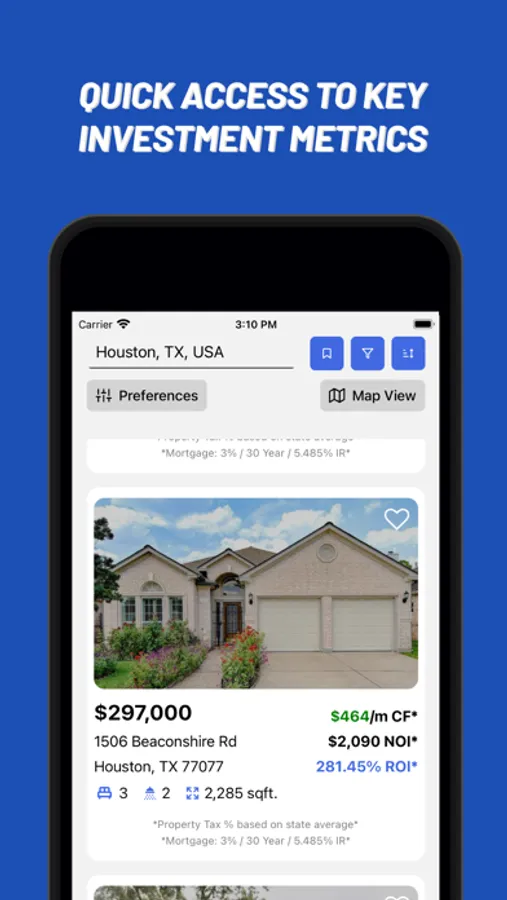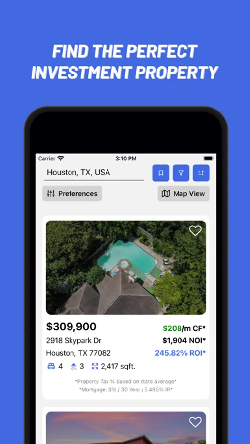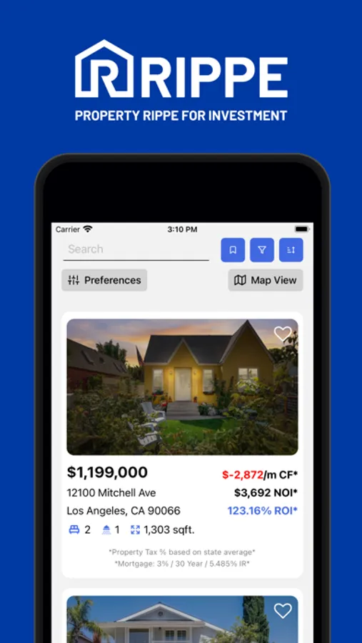 With the current version of Rippe, you can effortlessly search any city in the United States. Instantly view a curated list of properties, complete with investment metrics displayed right under the property information. The intuitive interface allows you to quickly assess each property's investment potential, saving you time and effort in your search for the perfect investment opportunity.