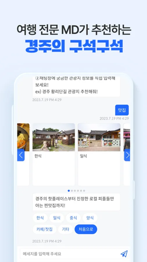 AI-based multilingual (Korean, English, Japanese, Chinese) chatbot support service that provides tourist information such as restaurants and hot pools in Hwangnidan-gil, Gyeongju