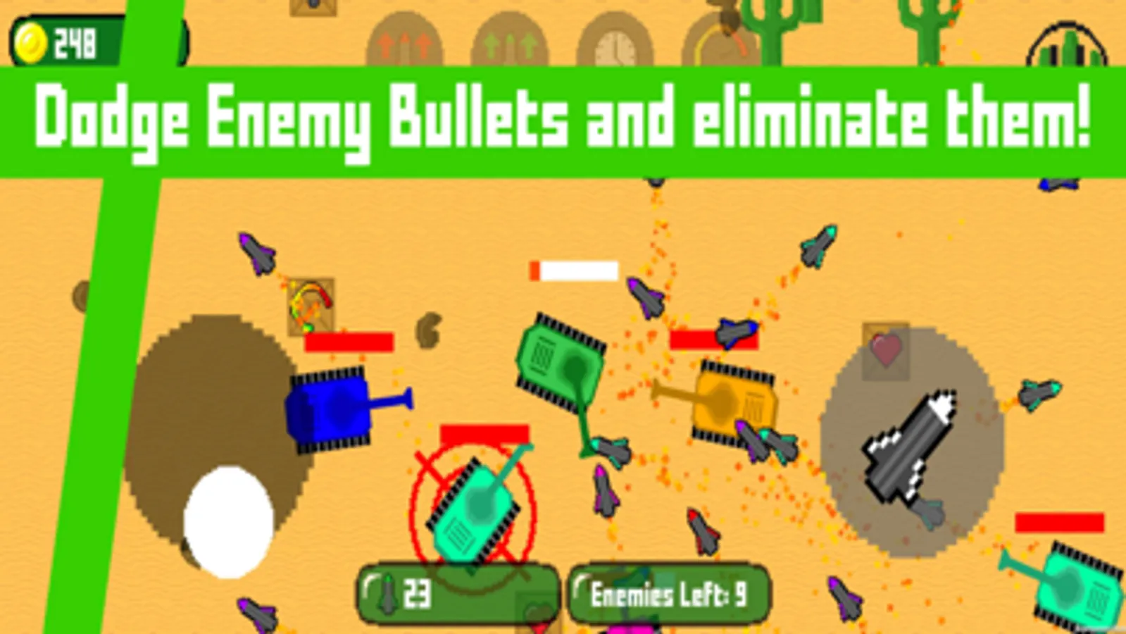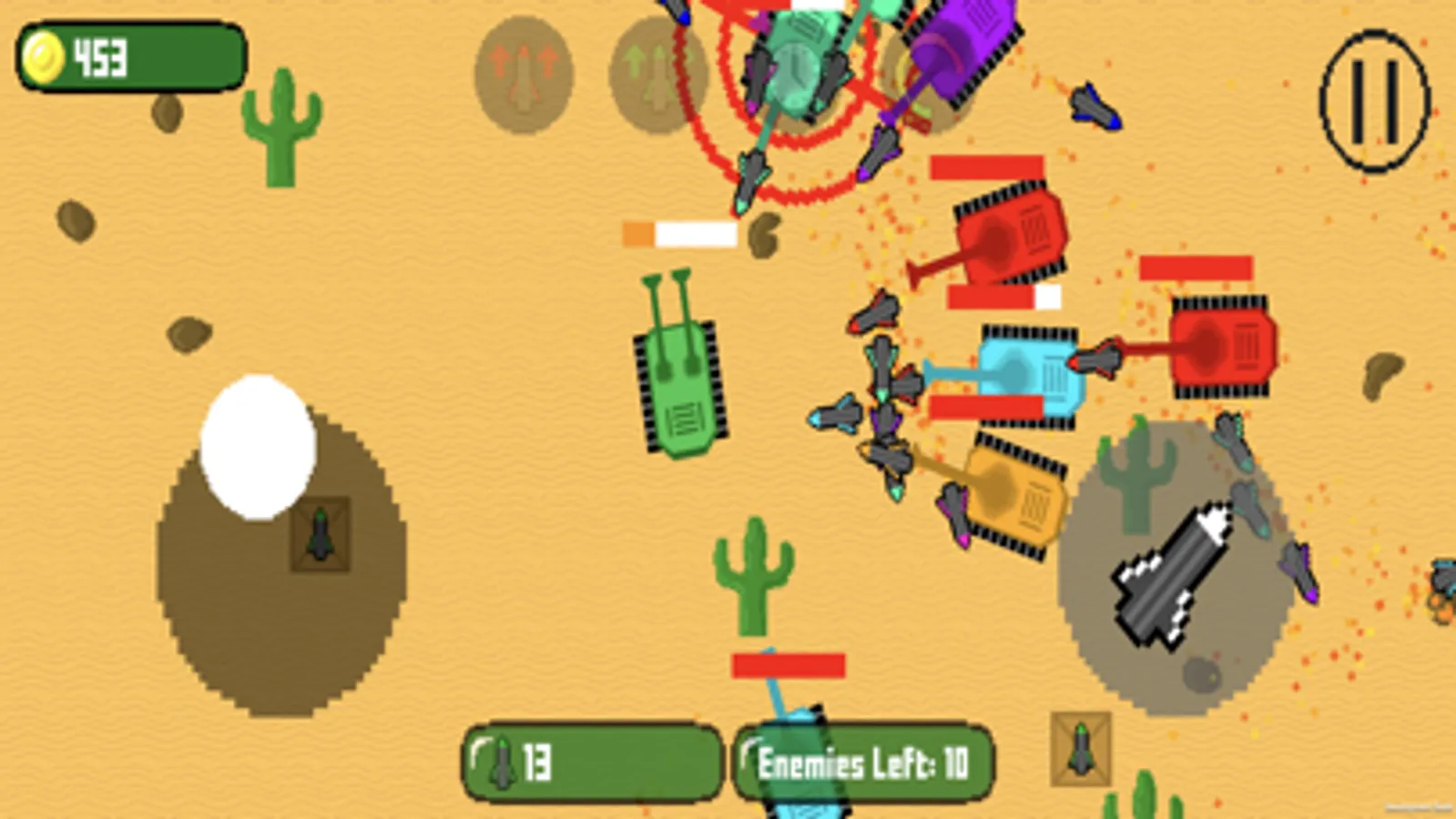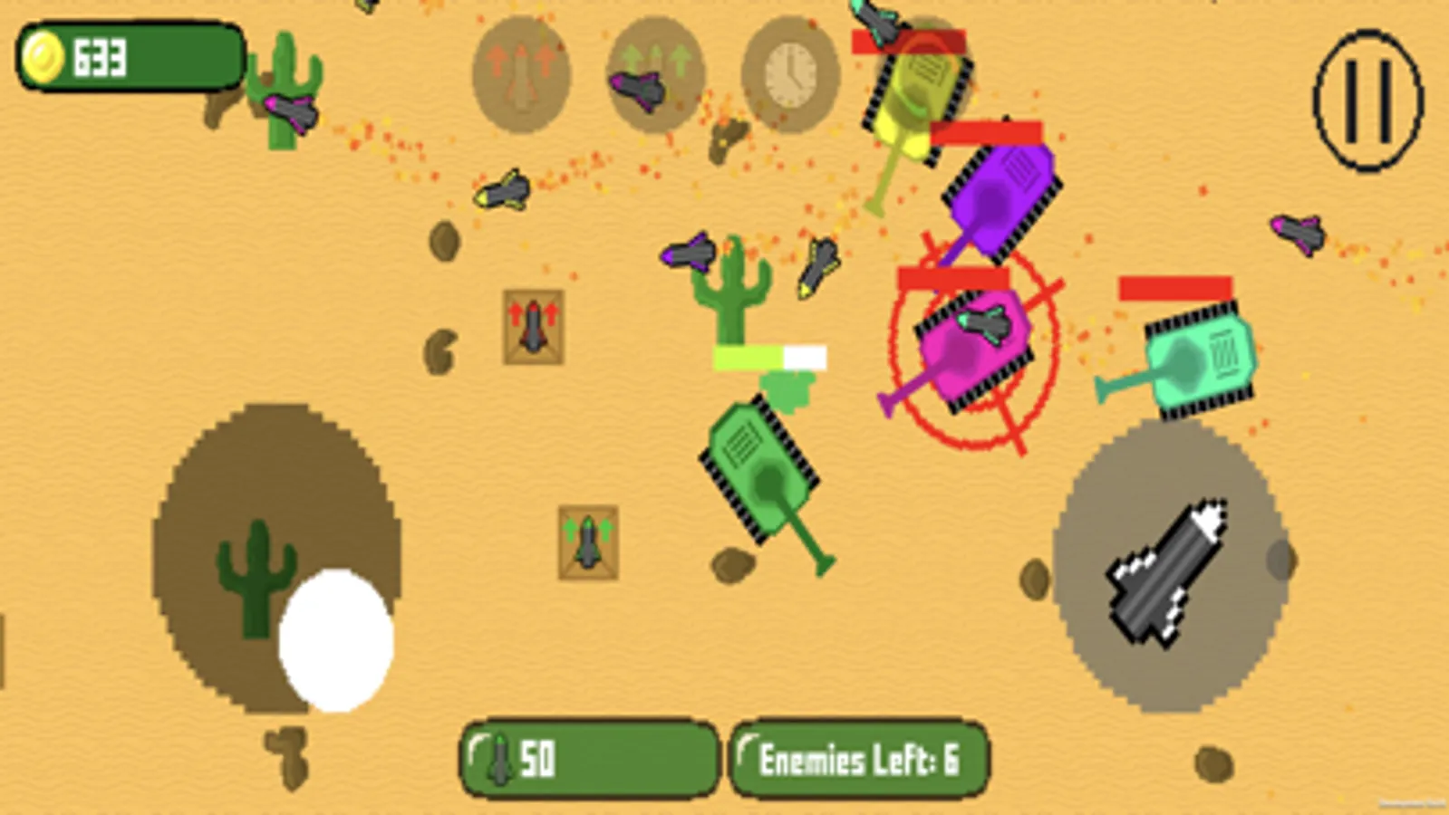 Use the joystick to dodge enemy missiles, but be careful, your tank isn't that fast. You can upgrade your speed, damage, and health in the shop to make everything easier. Eliminate enemy tanks by shooting them down using your missiles. As you progress, the rounds will get harder and the swarms of tanks will be larger.