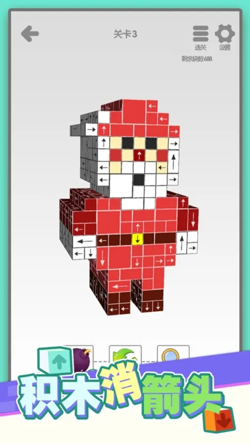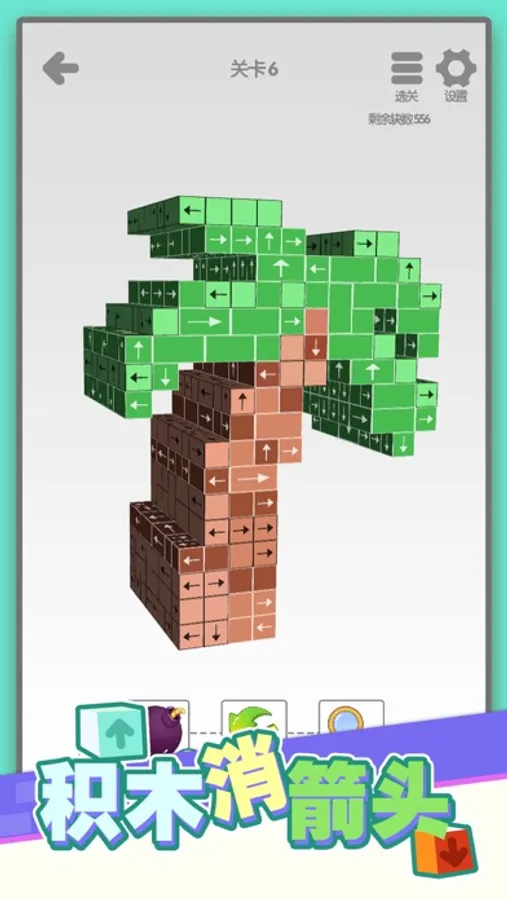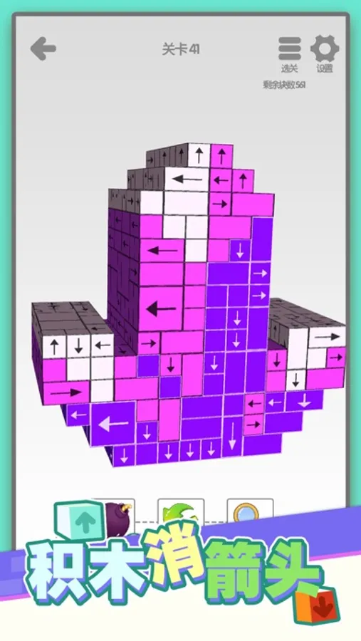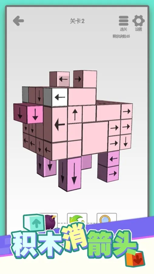 这是一款有趣的消除方块游戏,游戏中有许多由积木搭建的场景物体,它们都是由方块组成,你需要点击方块,让它们沿着箭头方向滑出去。游戏玩法轻松有趣,快来挑战一下吧。