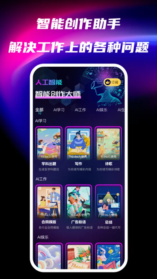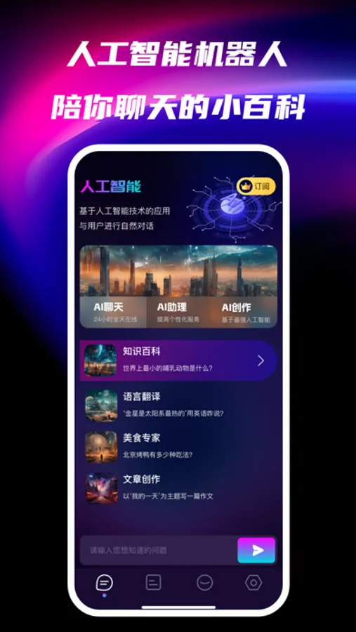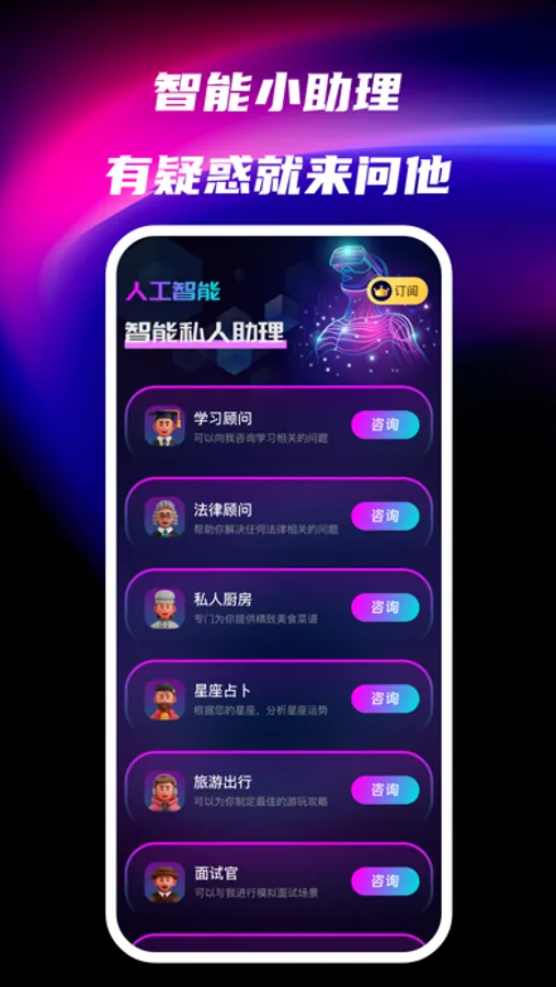 强大的AI人工智能能够帮你解决各式各样的难题,例如生活上的麻烦、工作上的困扰、学习上的难题、不知道做什么菜在厨房犯难等,TA都会给您提出合适的解决方案。大师级的创作者;AI写小说,解数学题还能写情书,创作灵感是这个年代像钻石一样珍贵的东西,可以为您提供无限的灵感!