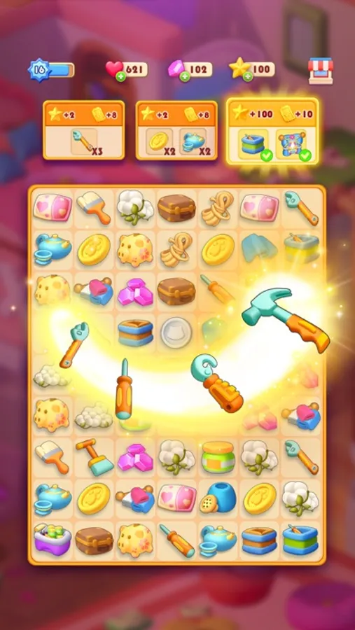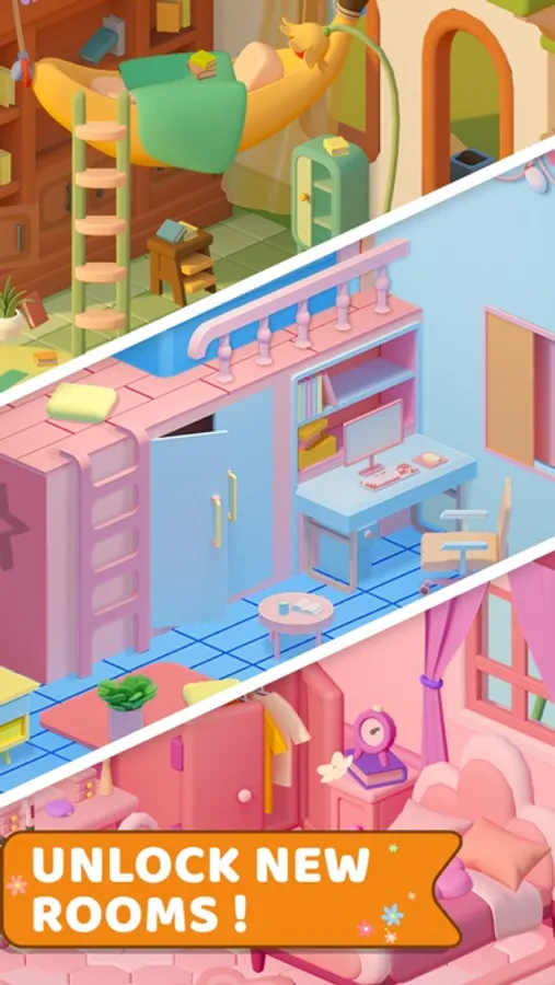 Merge and combine two identical elements in the puzzle game board to create new items and tools to renovate variety rooms such as living room, bedroom, kitchen, garden and greenhouse. After merging two same objects, you will receive tools used to unlock and upgrade every piece of furniture and corner of rooms, renovate and paint homes or mansions. By complete the process of makeover or redesigning spaces, enjoy the relaxing time and reveal your dream houses.