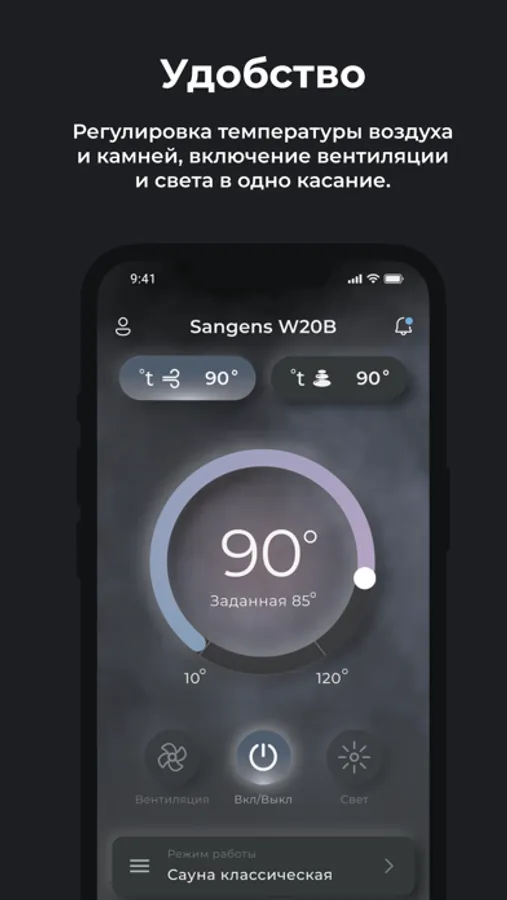 Удобство — регулировка температуры воздуха и камней, включение вентиляции и света в одно касание.