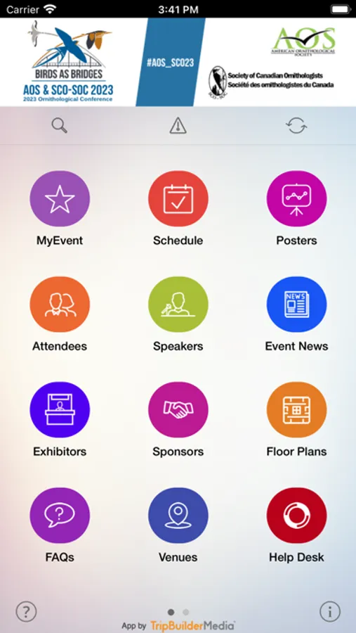 This TripBuilder Multi Event Mobile™ app is provided at no charge by the American Ornithological Society (AOS) and the Society of Canadian Ornithologists/Société des ornithologistes du Canada (SCO-SOC). It was designed and developed by TripBuilder Media Inc. If you have any questions, or need any support regarding how to use this app, please submit a Support Ticket (located within the Help icon in the app).
