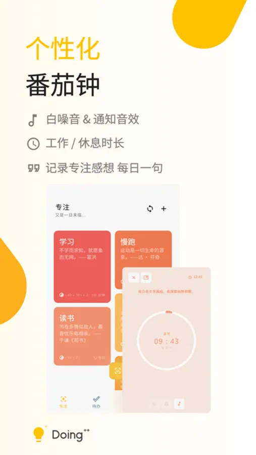 Doing++ 是一款含番茄钟、待办清单、云桌等特色功能的时间管理应用,可以有效帮助您管理时间,提升效率。
