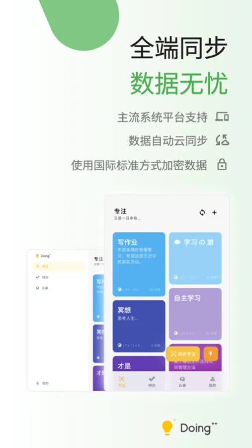 Doing++ 已支持有桌面平台与移动平台,您的数据在登录后也将会在不同平台间进行云同步,保障您的体验。