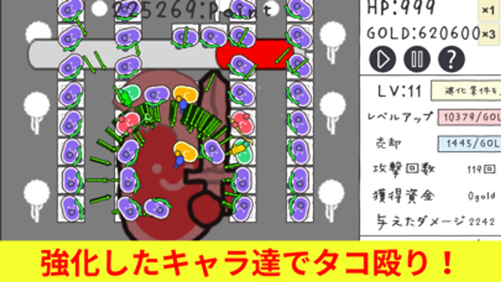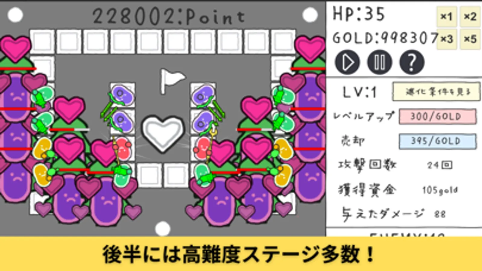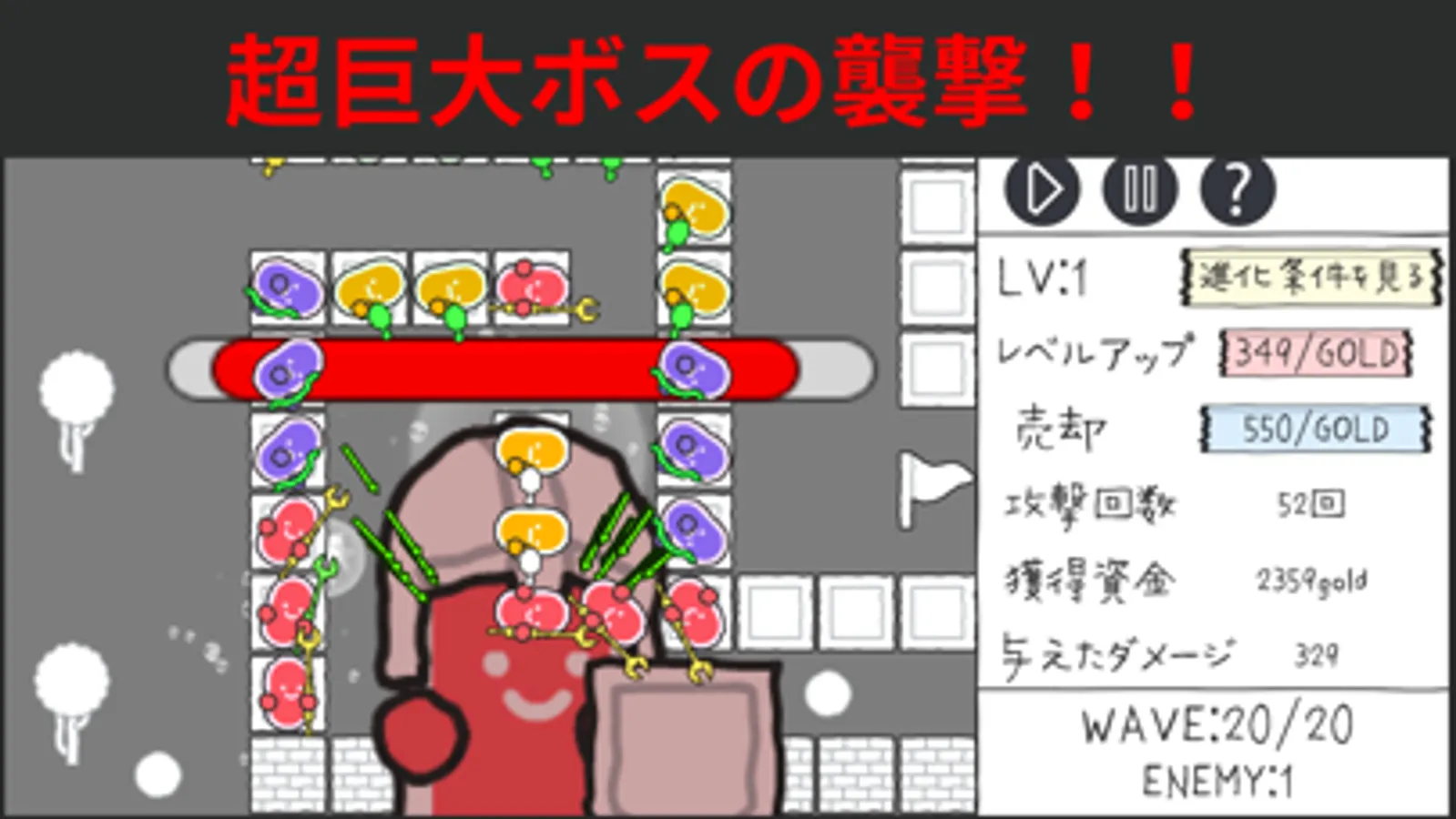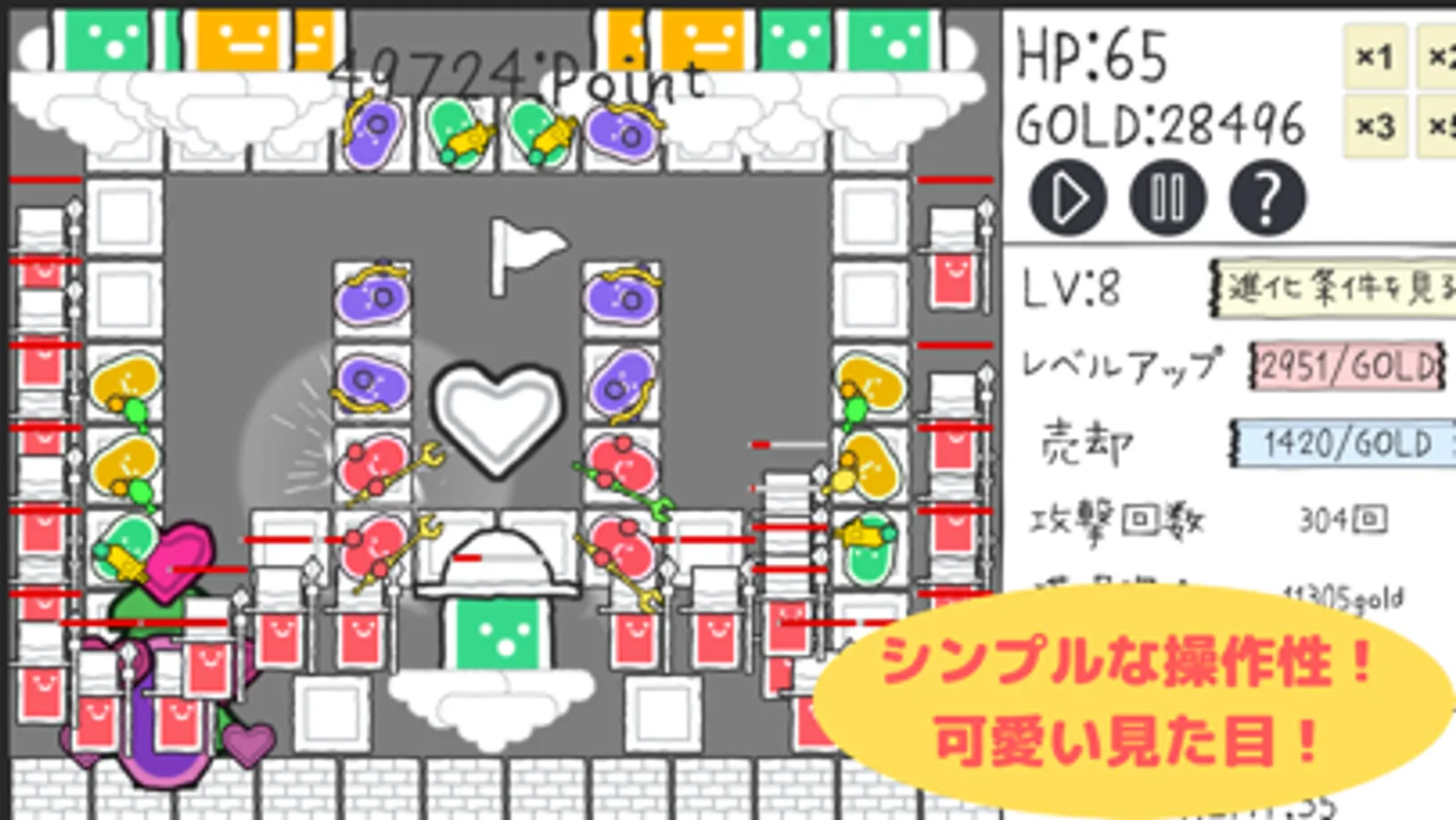 * 戦略的な防衛と戦術: 戦略的な防衛と巧妙な戦術が求められます。プレイヤーは弓矢(アロー)や銃使い(ガン)、光線使い(レーザー)、魔法使い(マジック)などのキャラクターを配置し、敵の攻撃を防ぎながら勝利を目指します。敵の耐性や特性を把握し、適切なタイミングで味方を進化や強化を起こすことが重要です。オススメは魔法使いですね!