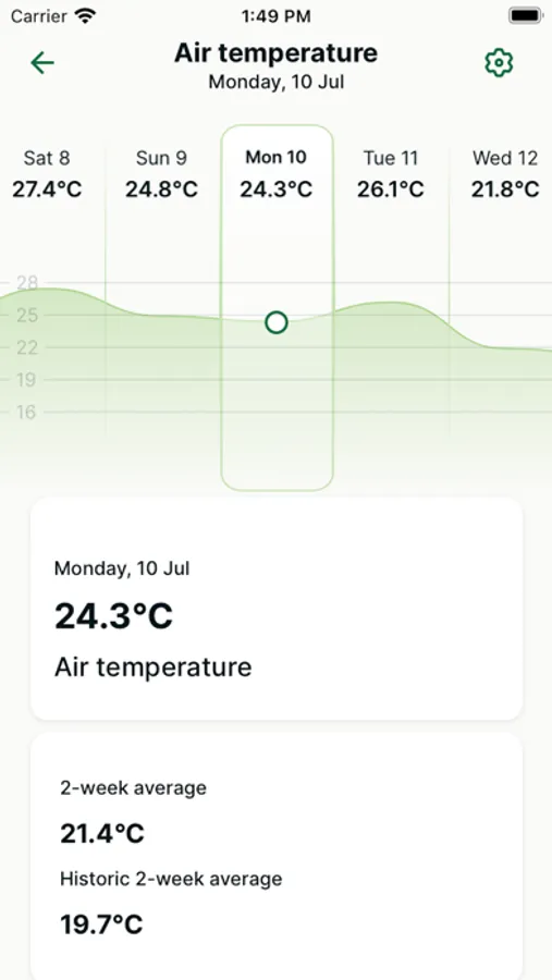 Stay ahead of the game with our app's 7-day weather forecast feature. Not only does it provide future weather data, but it also maps out weather conditions from the past 7 days. This helps turf managers understand their current position in a weather pattern and make informed decisions about course maintenance.