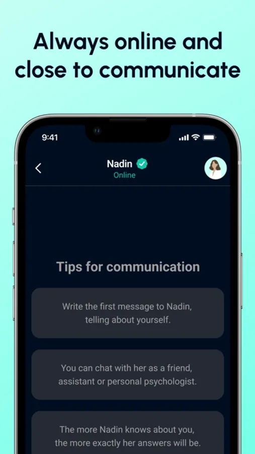 Equipped with tools to help you cope with emotional stress, anxiety, or depression, Nadin AI can provide self-help advice, guide you through meditation, or simply be there for you during difficult times.