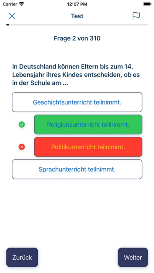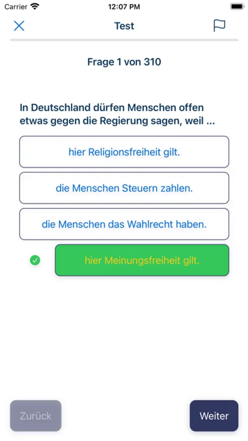 Die App bietet dir eine realistische Testumgebung, um dein Wissen zu überprüfen und dich auf den eigentlichen Einbürgerungstest vorzubereiten. Du kannst verschiedene Testmodi wählen, einschließlich des vollständigen Tests mit allen 310 Fragen oder eines gezielten Modus, um dich auf bestimmte Themengebiete zu konzentrieren.