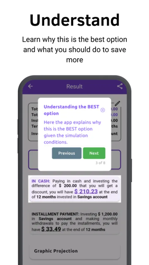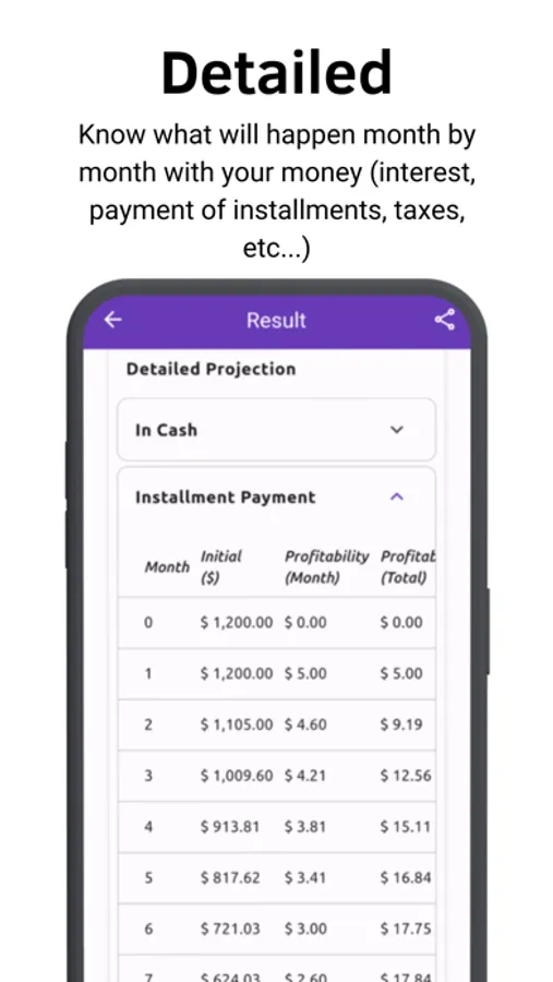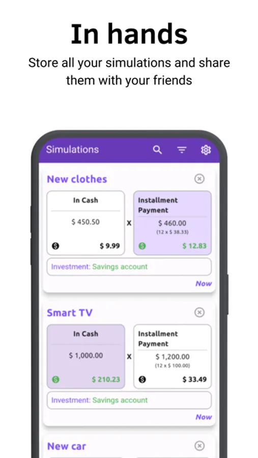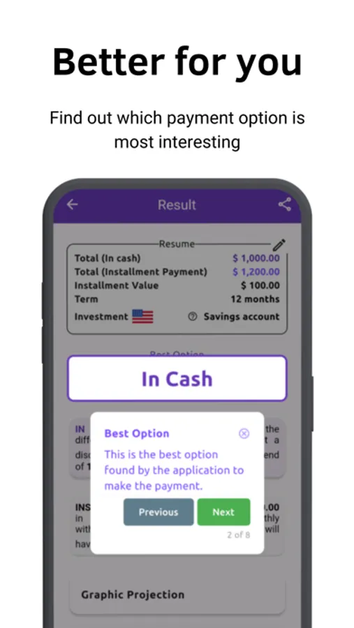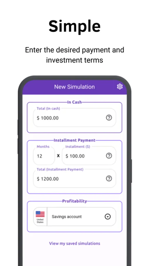 Just enter the values of the payment options you have available for any purchase (in cash or in installments) and select the place where you usually leave your money saved and invested. After that, the app will help you decide which is the best way to pay.