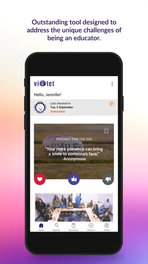 Violet offers personalized support to promote educators’ well-being. As an educator you have access to individualized content and learning experience(s) to help educators feel valued, engaged, and empowered. Violet's highly personalized self-care tools like mood-tracking videos, stories, inspirational quotes and humor helps provide support and improves job satisfaction. Prioritizing personal health can lead to a more fulfilling and satisfying life inside and outside the classroom.