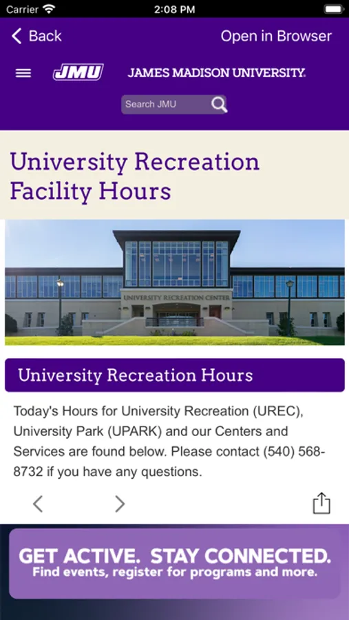 The official app of James Madison University Recreation! This app provides easy access for the JMU community with the use of a digital barcode to enter the facility. Register for programs and services. Get push notifications on facility hour changes and involvement opportunities. Download the JMU UREC App to stay connected today!