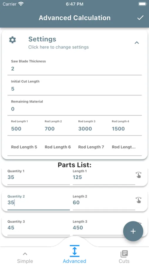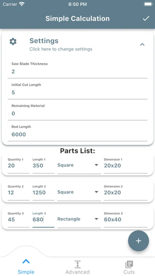 Simple Mode: Enter your preferred rod length and parts list, and CutMetryx calculates the amount of material that needs to be ordered, as well as the optimal cut.