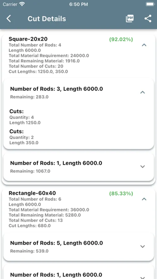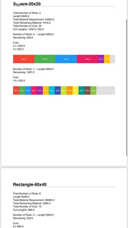 Cutting Category: Retrieve, share, save, or print all calculated cuts. The prints also include a visual representation of the cuts for each rod.