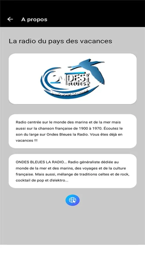 Radio dédiée au monde de la mer et des marins mais également dédiée à la chanson française de 1900 à 1970. Soyez toute l’année en vacances avec Ondes Bleues la Radio