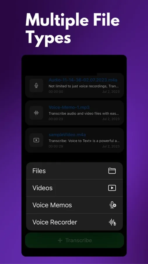 * Import Multiple File Types: Not limited to just voice recordings, Transcribe: Voice to Text+ enables you to import various file formats, including videos, voice memos, and other supported audio files. This flexibility ensures that you can transcribe content from diverse sources.