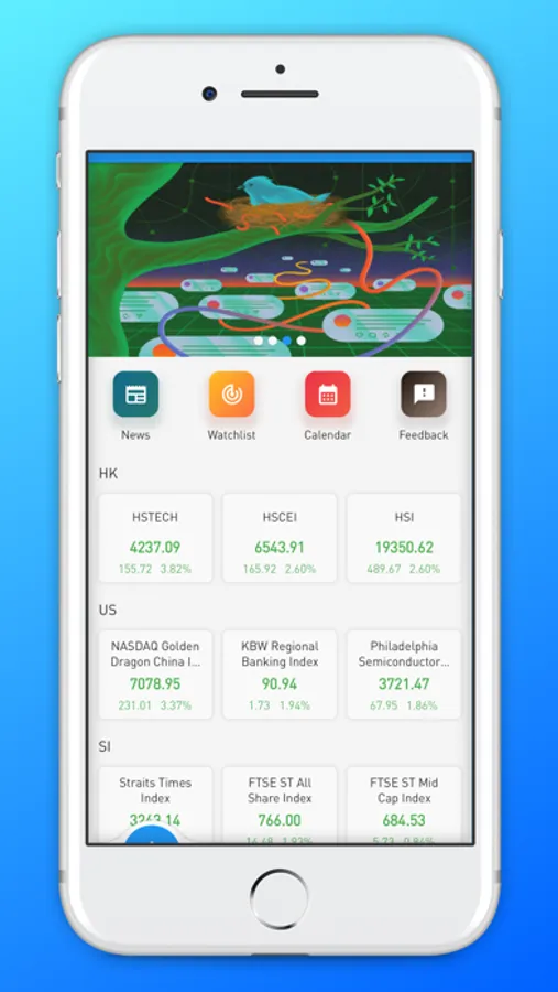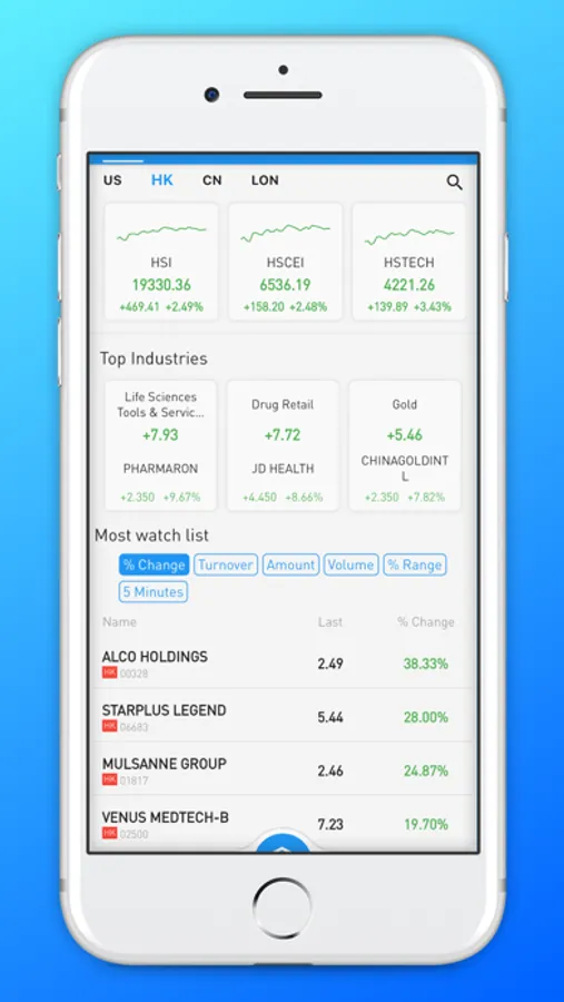 The stock module offers market information for major stock markets, including the US, HK, CN, and UK. Additionally, users can access stock-related indicators and charts such as 1-minute and 5-minute line charts, as well as daily, 5-day, and weekly K-line charts.