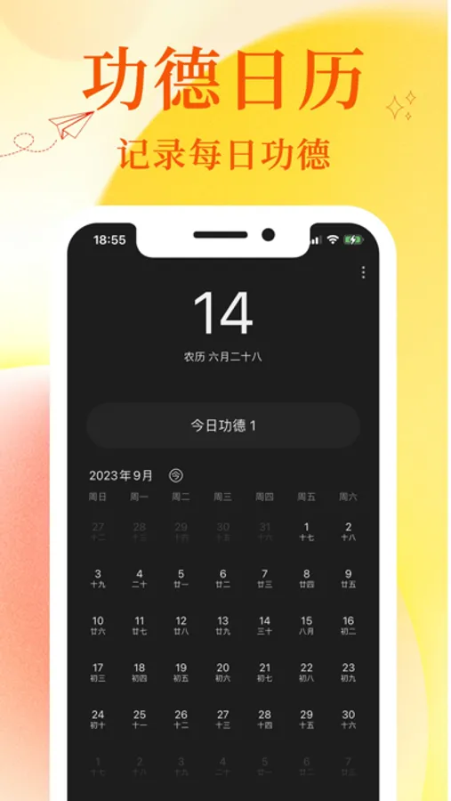 本应用,以日历的形式记录功德,可让修行者记录自己的言行,也可以让普通人反省自新。