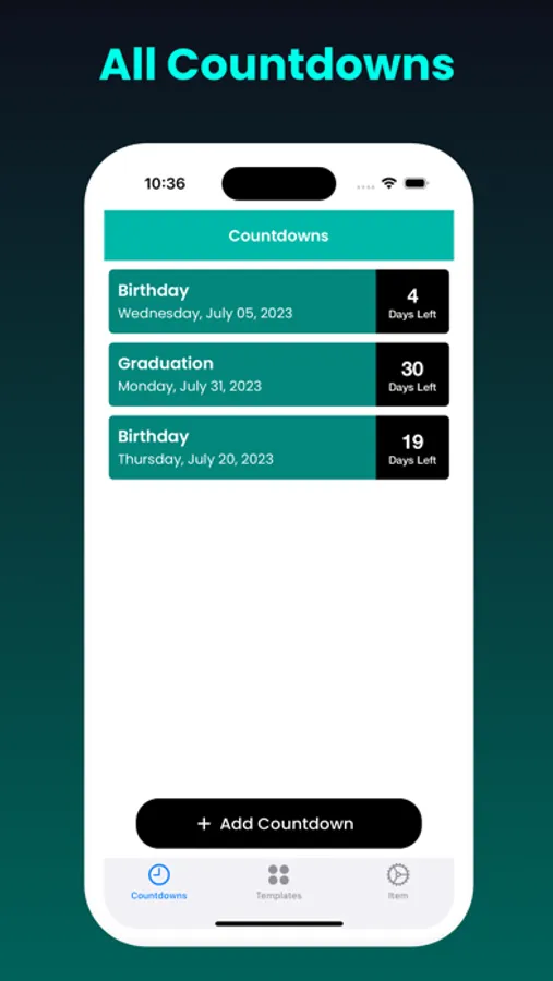 Countdown the days until birthday and any other special event with the precise countdown timer that keeps you eagerly anticipating the big moment. Countdowns can be added in just 2 simple steps. Enter the event name and then select the date and you're done.