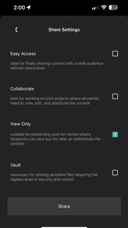 With DriveSafe's seamless iMessage integration, sharing files has never been more secure and easy. Select your file, choose your sharing permissions, and send it directly through iMessage to one person or collectively to everyone in a group chat. Keep control even after you hit send.