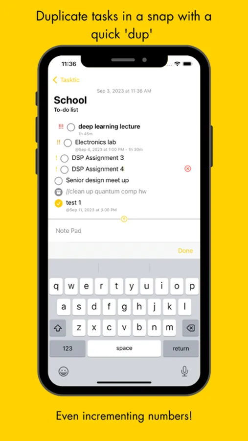 - Got some repetitive tasks such as quiz 1 dup and oh wow quiz 2? Yes all you need to do is type dup after the task and it will automatically replicate your task. If your task had a number such as release v1.2 dup .... release v1.3, it will also increment that.