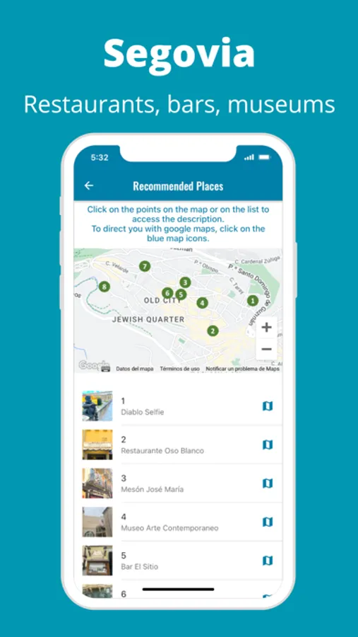 1.- An interactive map of your situation and that of the points of tourist interest along the route, and also the location of restaurants and typical places.