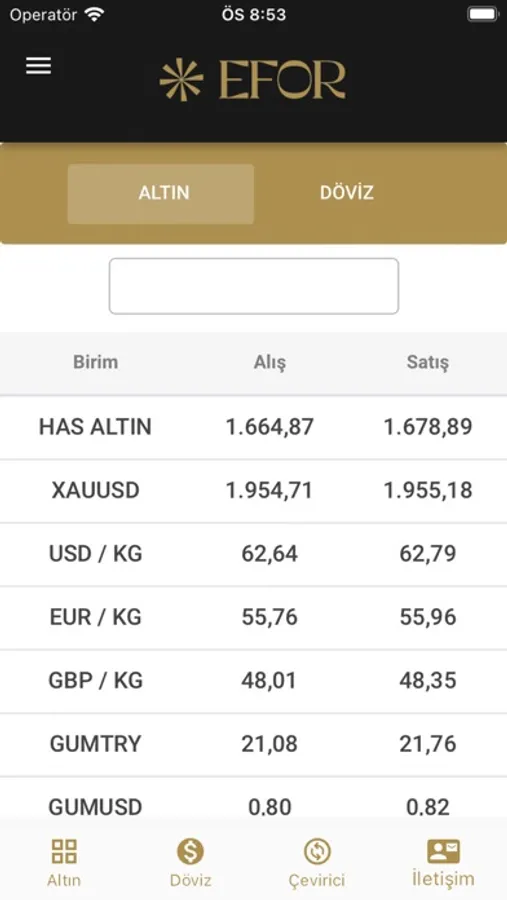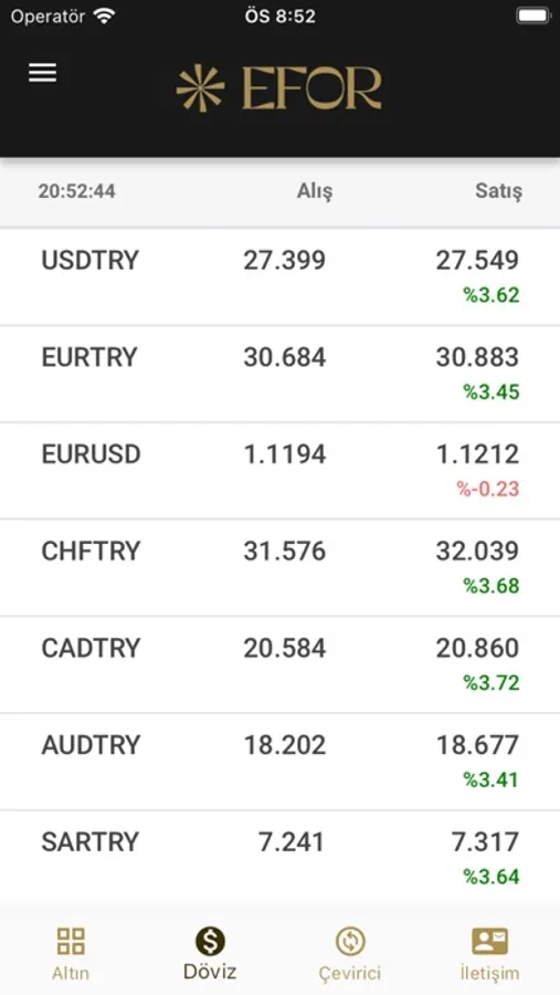 Efor Altın uygulaması ile Dolar, Euro, Dolar Euro Paritesi, Sterlin, ve daha bir çok para birimi için anlık ve canlı döviz kurları takip edilebilir.