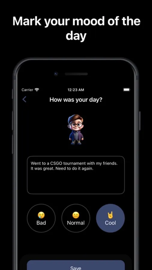 - Easy mood selection: Just one tap to select one of three moods: "not great," "okay," or "cool." No extra words or complicated questionnaires, just mark how you're feeling at the moment.