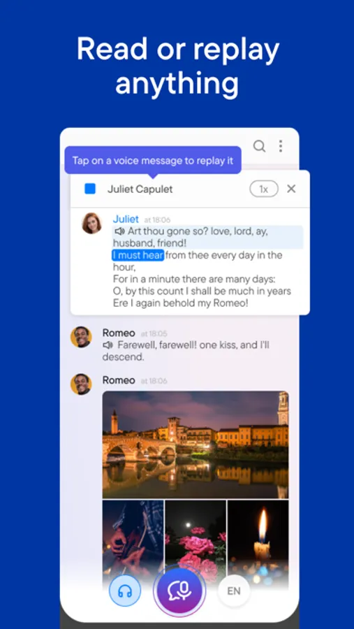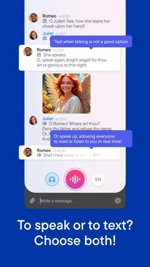 We redefine the way voice messaging and texting works. You can simply talk in any of our chats. When you talk, we deliver your voice and its transcript – all in real-time.