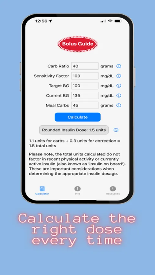 Bolus Guide is a user-friendly tool designed to simplify life for those living with diabetes. This app is built with an intuitive interface to help calculate the correct amount of insulin needed for pre-meal bolus and correction doses. By inputting a few critical pieces of data - such as carb ratio, sensitivity factor, target blood glucose, current blood glucose, and meal carbs - Bolus Guide quickly generates the insulin dose you require. The calculated dose is provided as both an exact number and a rounded value for easy and safe insulin administration. The goal of Bolus Guide is to provide you with increased confidence in your insulin dosing, contribute to better glycemic control, and promote an overall improved quality of life. Please note that while Bolus Guide is a helpful tool, it should be used in conjunction with advice from medical professionals. Your health is our priority, and we aim to make living with diabetes a bit easier with Bolus Guide.