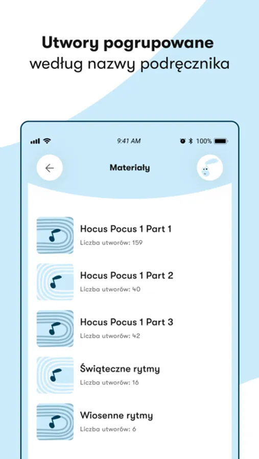 Z aplikacją Early Stage masz dostęp do wszystkich niezbędnych utworów z naszego kursu języka angielskiego – zarówno do piosenek, historyjek, jak i innych utworów towarzyszących naszym zajęciom. Zostały spakowane do przejrzyście opisanych folderów, dzięki czemu z łatwością je odszukasz. W razie potrzeby możesz skorzystać również z lupki – aby w kilka sekund znaleźć piosenkę, która chodzi Ci po głowie!