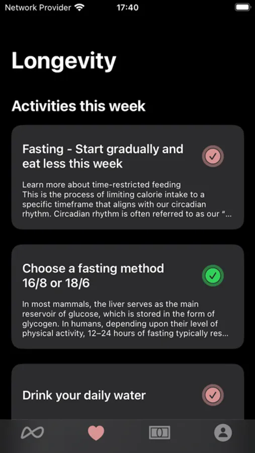 Discover a new era of well-being with Longevity4.0. An app designed to seamlessly integrate healthy behaviours into your daily routine. Harness the power of advanced technology, expert guidance, personalized activities, and a thriving community to boost your longevity and enhance your overall quality of life. Whether you're looking to cultivate joy, adopt healthy habits, or simply live a more fulfilling life, Longevity4.0 is your ultimate companion on this transformative journey. Join us today and unlock a future of well-being and vitality!