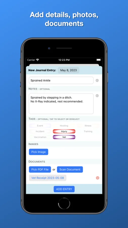 ・Journal: Log anything you consider important, tag those entries with suitable labels. Attach photos from your photo library or documents either from your files app or by scanning them directly.